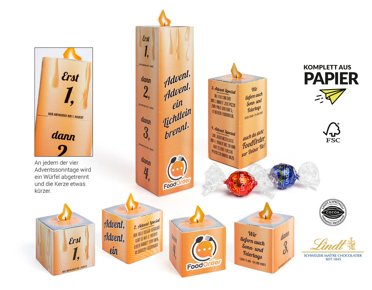 Lindt Lindor „Adventskerze” ECO, Preise in Euro pro Stück inkl. individuellem Druck, zzgl. MwSt. und Versand