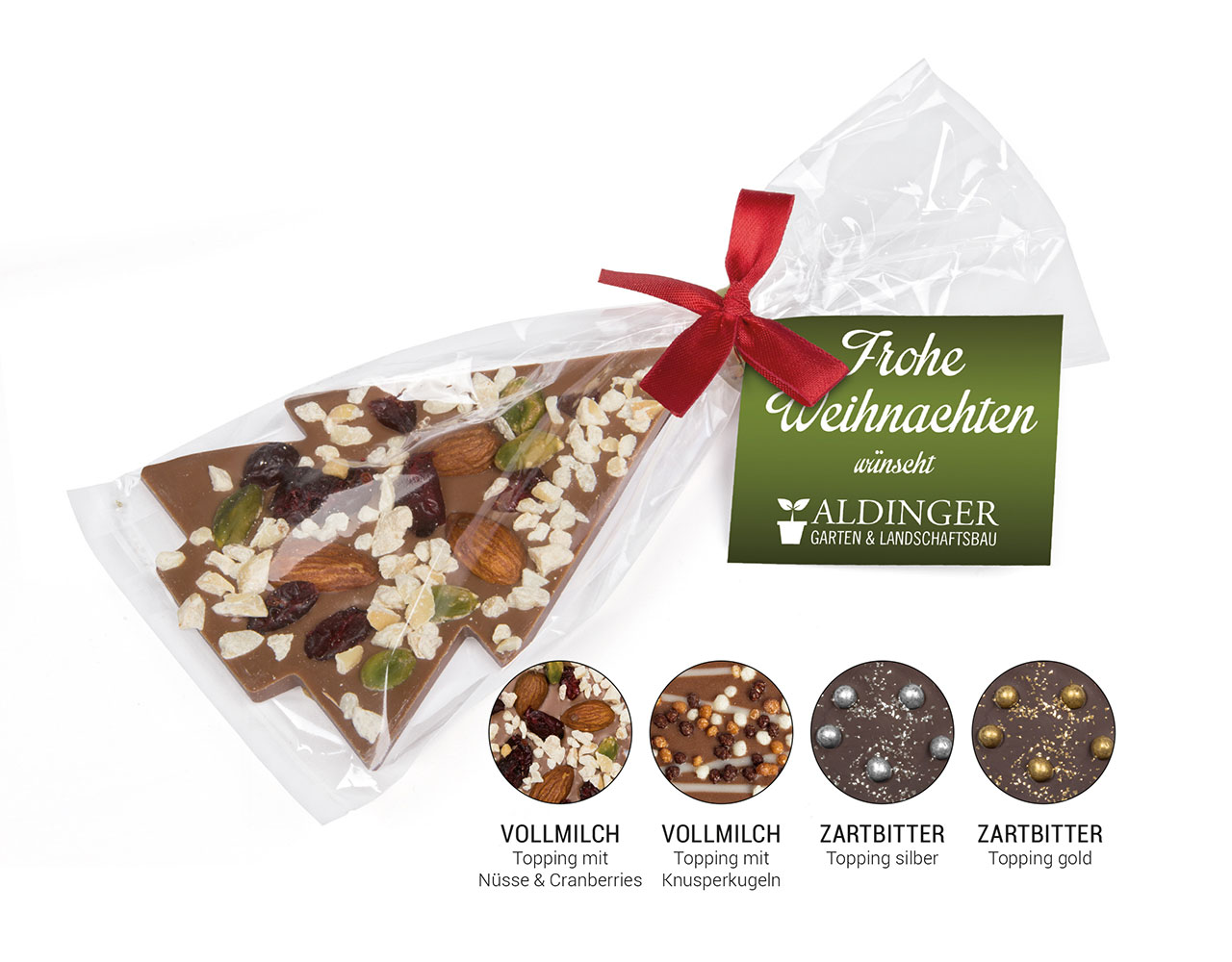 Schoko Christmas Tree, Preise in Euro pro Stück inkl. individuellem Werbekärtchen, zzgl. MwSt. und Versand
