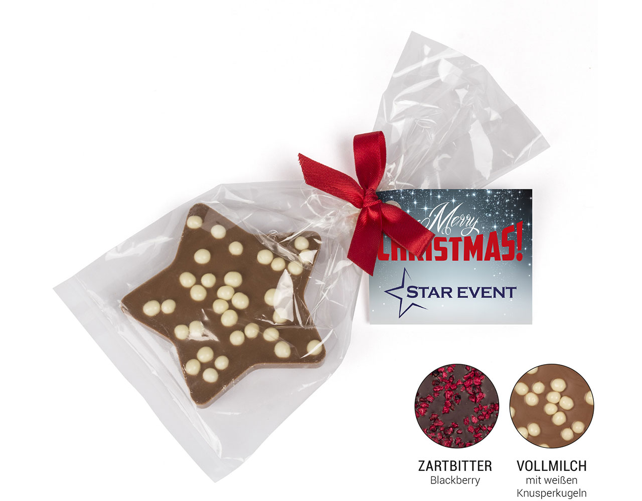 Schoko Weihnachtsstern, Preise in Euro pro Stück inkl. individuellem Werbekärtchen, zzgl. MwSt. und Versand